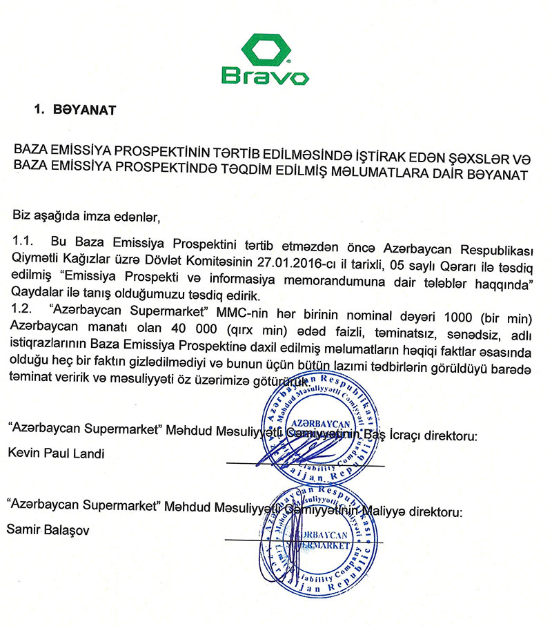 “Azərbaycan Supermarket” MMC şirkəti “Bravo Supermarket” MMC şirkətinin yeganə təsisçisidir. Hal-hazırda “Bravo Supermarket” MMC-nin fəaliyyəti dondurulmuşdur.