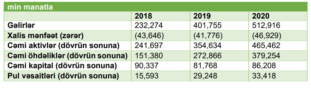 Marja-nın əldə etdiyi məlumata görə, şirkətin xalis zərəri 2018-ci ildə 43 milyon 646 min manat, 2019-cu ildə 41 milyon 776 min manat, 2020-ci ildə 46 milyon 929 min manat təşkil edib.