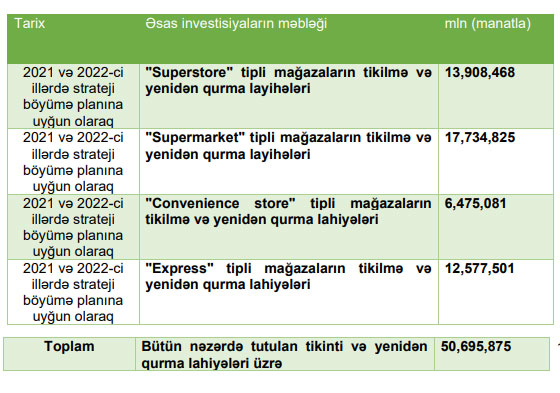 Marja şirkətə istinadən xəbər verir ki, "Superstore" tipli mağazaların tikilmə və yenidən qurma layihələri üzrə 13 milyon 908 min 468 manat, "Supermarket" tipli mağazaların tikilmə və yenidən qurma layihələri üzrə 17 milyon 734 min 825 manat, "Convenience store" tipli mağazaların tikilmə və yenidən qurma lahiyələri üzrə 6 milyon 475 min 81 manat, "Express" tipli mağazaların tikilmə və yenidən qurma lahiyələri üzrə 12 milyon 577 min 501 manat xərclənməsi planlaşdırılır.