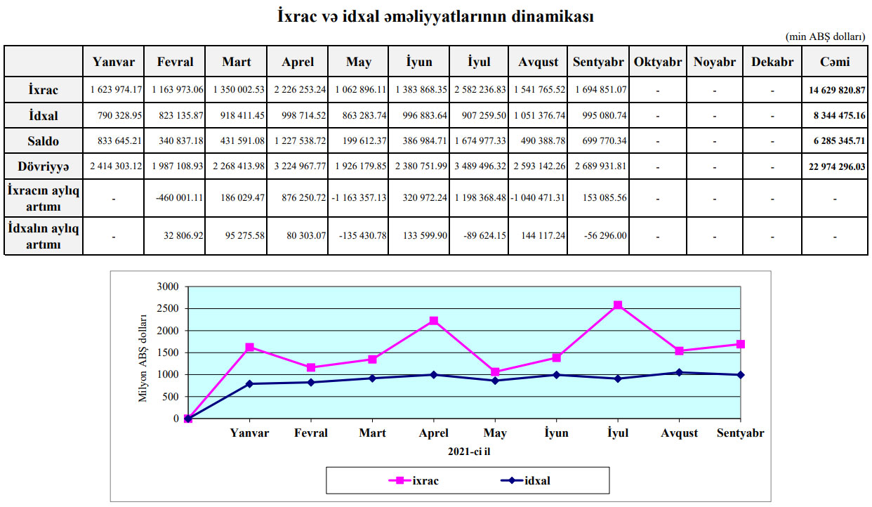 2021-ci ilin 9 ayında (yanvar-sentyabr dövründə) Azərbaycanın cəmi xarici ticarət əməliyyatlarının həcmi 22 milyard 974 milyon 296 min ABŞ dolları, o cümlədən idxal əməliyyatları 8 milyard 344 milyon 475 min ABŞ dolları, ixrac əməliyyatları 14 milyard 629 milyon 821 min ABŞ dolları, müsbət xarici ticarət saldosu 6 milyard 285 milyon 345 min ABŞ dolları təşkil edib.
