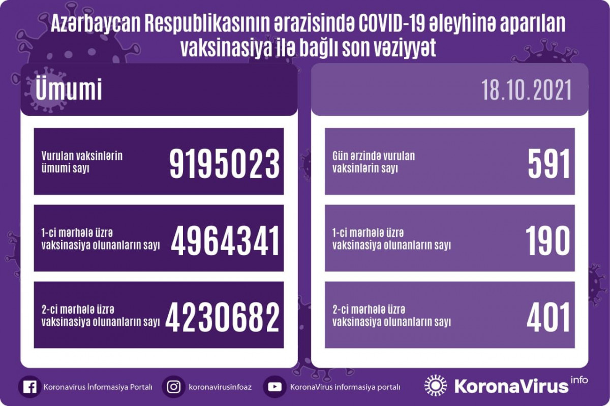 Ölkədə vurulan vaksinlərin ümumi sayı 9 195 023, birinci mərhələ üzrə vaksinasiya olunanların ümumi sayı 4 964 341, ikinci mərhələ üzrə vaksinasiya olunanların sayı isə 4 230 682 təşkil edir.