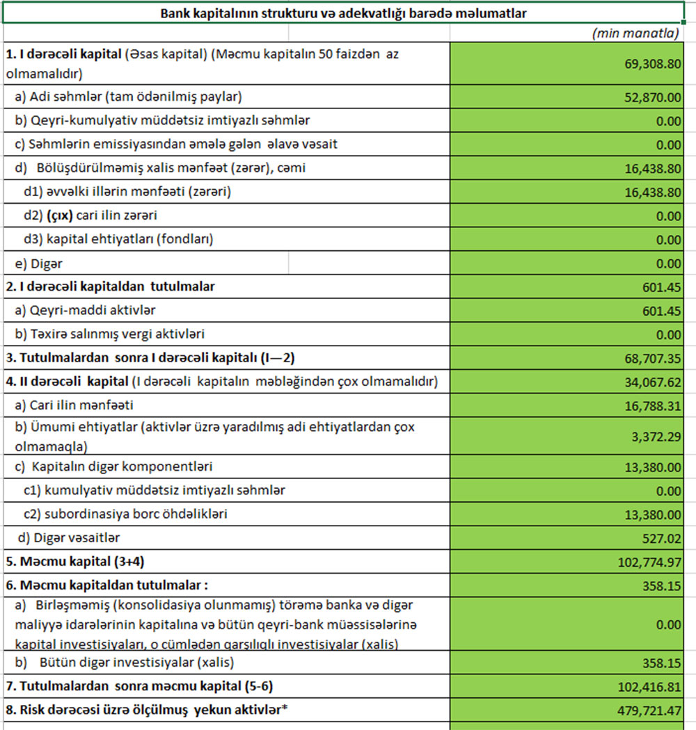30 Sentyabr 2021-ci il tarixində "Bank of Baku" 102 milyon 416 min manat məcmu kapitala malik olub, bu da banklara dair minimal məcmu kapital tələbindən (50 milyon manat) azı 2 dəfə çoxdur. Xatırladaq ki, 31 Dekabr 2020-ci il tarixində Bank of Baku 88 milyon 43 min manat məcmu kapitala malik idi.