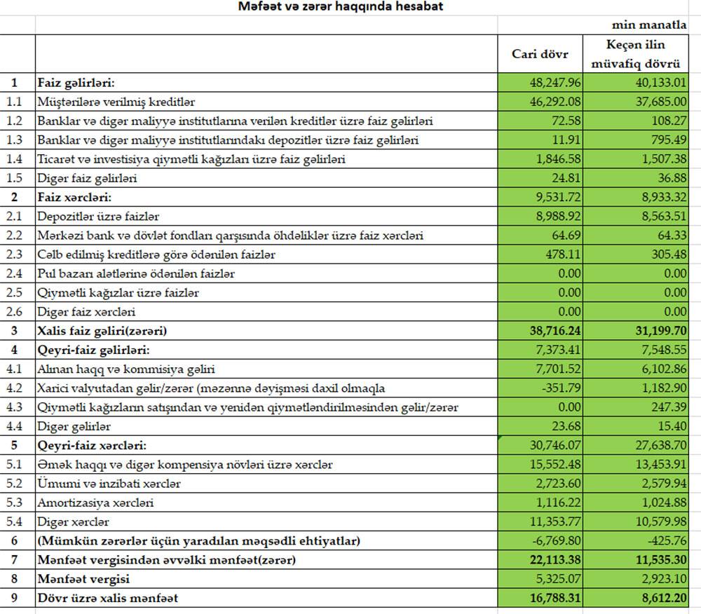 Xatırladaq ki, 2021-ci ilin yanvar-sentyabr dövründə “Bank of Baku”nun cəmi əməliyyat gəlirləri (faiz və qeyri-faiz gəlirləri) 47 milyon 681 min manat, cəmi əməliyyat xərcləri (faiz və qeyri-faiz xərcləri) 36 milyon 572 min manat təşkil etmişdi. Gəlirlər xərcləri üstələdiyindən Bankın 11 milyon 109 min manat əməliyyat mənfəəti yaranmışdı. Eyni zamanda, mümkün zərərlər üçün yaradılan məqsədli ehtiyatlardan azad olmuş 426 min manat mənfəətə əlavə edilmiş  və  mənfəət 11 milyon 535 min manata yüksəlmişdi.  “Bank of Baku”  2 milyon 923 min manat mənfəət vergisi ödədiyindən ötən ilin 9 ayını 8 milyon 612 min manat xalis mənfəət ilə bağlamışdı.