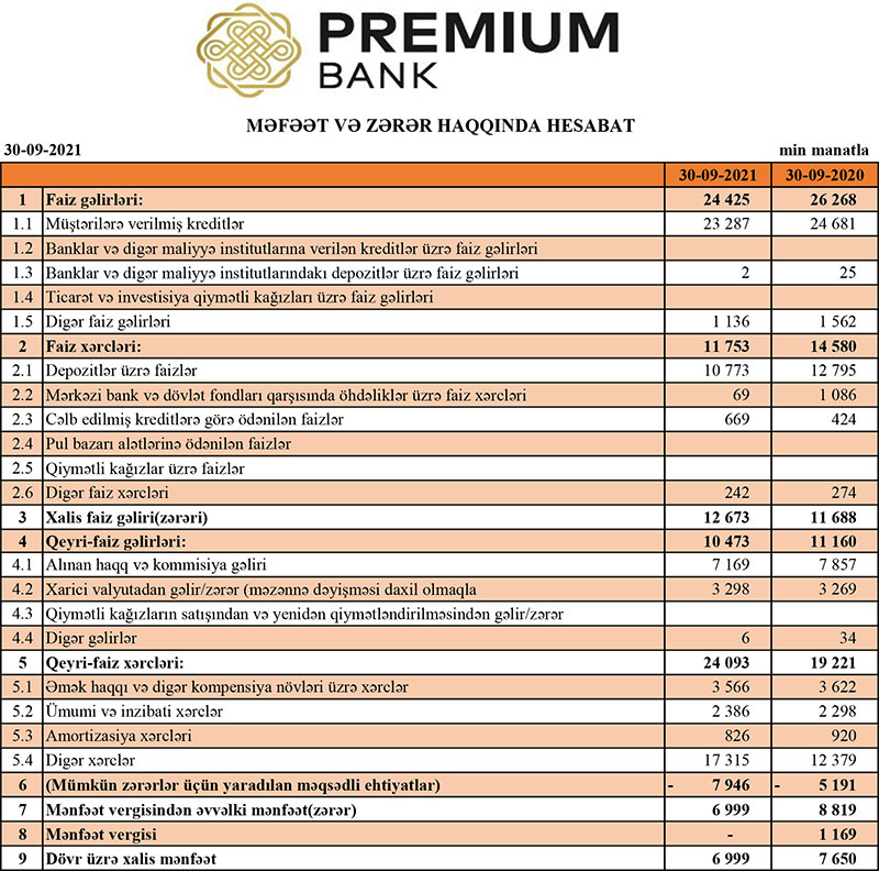 Qeyd edək ki, “Premium Bank”ın 2020-ci ilin 9 ayında 37 milyon 428 min manat cəmi əməliyyat gələrilərinə (faiz və qeyri-faiz gəlirlərinə) qarşı cəmi əməliyyat xərcləri (faiz və qeyri-faiz xərcləri) 33 milyon 801 min manat təşkil etmiş, gəlirlər xərcləri üstələdiyindən 3 milyon 627 min manat əməliyyat mənfəəti yaranmışdı. Mümkün zərərlər üzün yaradılan ehtiyatdan azad olmuş 5 milyon 191 min manatın hesabına mənfəət 8 milyon 819 min manata yüksəlmişdi. Bank 1 milyon 169 min manat mənfəət vergisi ödədiyindən həmin dövrü 7 milyon 650 min manat xalis mənfəət ilə bağlamışdı.
