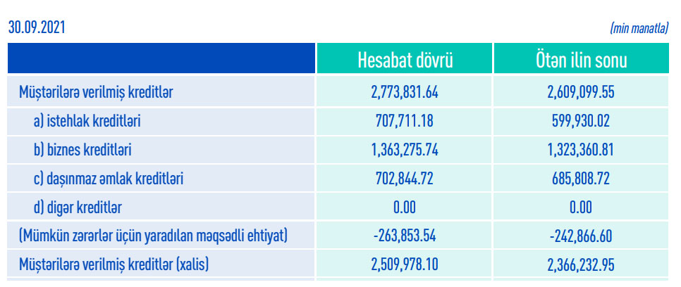 "ABB"nin xalis kredit portfeli (mümkün zərərlər üçün yaradılan məqsədli ehtiyat xaric kredit portfeli) 143 milyon 745 min manat artaraq 2 milyard 509 milyon 978 min manata çatıb. Mümkün zərərlər üçün yaradılan məqsədli ehtiyat 20 milyon 987 min manat artaraq 263 milyon 853 min manata yüksəlib.