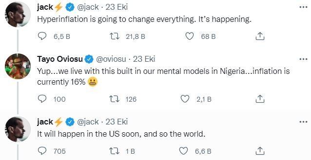 Dorsey, Cümə gecəsi yazdığı "twit"ində ABŞ-da və bütün dünyada hiper infilyasiyanın olacağını bildirib. Dorsey, "Hiper inflyasiya hər şeyi dəyişdirəcək",- qeyd edib.