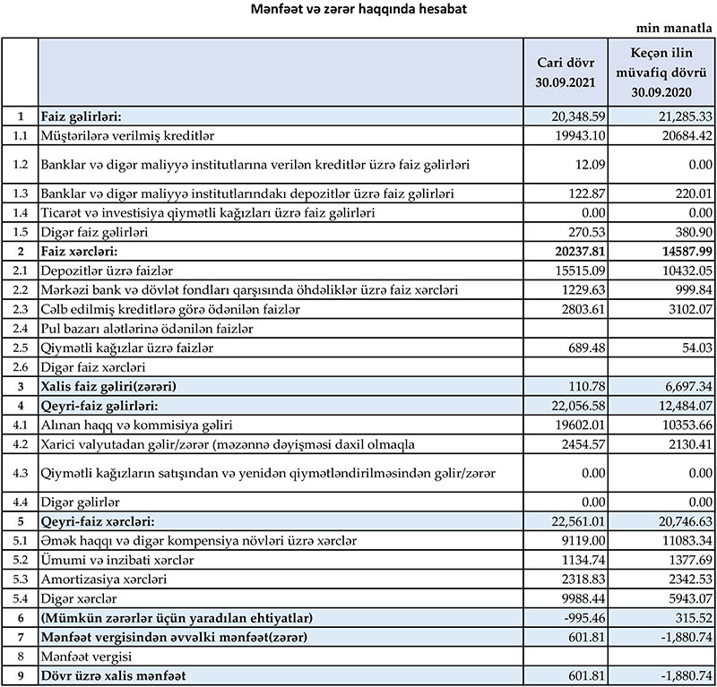 “Muğanbank” ASC 2021-ci ilin 9 ayını 602 min manat xalis mənfəət ilə başa vurub. Halbuki, Bank ötən ilin eyni dövrünü 1 milyon 881 min manat xalis zərər ilə bağlamışdı. Bankın cəmi gəlirlərinin artması və mümkün zərərlər üçün yaradılan ehtiyatlardan azad olmuş vəsait Bankın xalis mənfəət ilə fəaliyyət göstərməsini təmin edib.