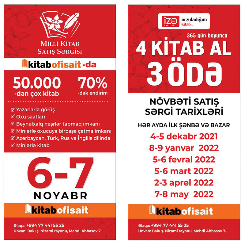 Qeyd edək ki, Milli Kitab Sərgisi davamlı olacaqdır. Belə ki, hər ayın ilk şənbə və bazar günləri "Kitab Ofisait” mağazasında Milli Kitab Sərgisi təşkil ediləcəkdir.