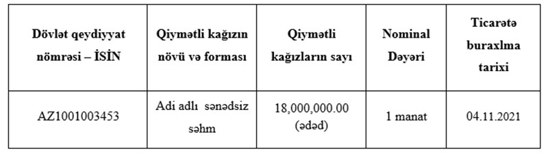 Emissiya prospektinə əsasən 4 noyabr 2021-ci il tarixində səhmlər üstünlük hüququna malik investorlar arasında yerləşdiriləcəkdir, 5 noyabr 2021-ci il tarixində isə yerləşdirilməyən səhmlər digər investorlar arasında növbəti iş günü ərzində yerləşdiriləcəkdir.