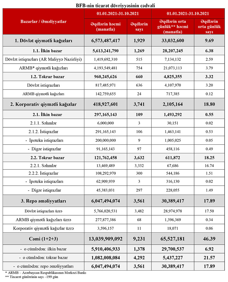 Dövlət istiqrazları ilə təkrar bazarın həcmi isə ötən ilin 10 ayında 463 milyon 643, min 386 manat ikən, bu ilin 10 ayında 817 milyon 485 min 971 manat təşkil edib.