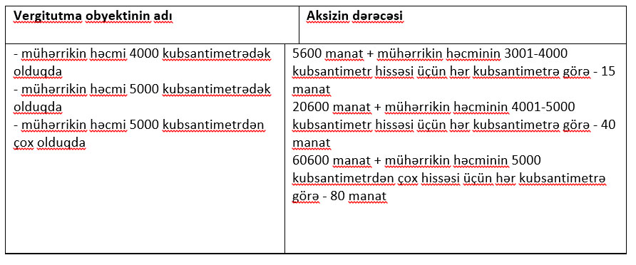 Mühərrikin həcmi 5 000 kubsantimetrədək olduqda 20 600 manat + mühərrikin həcminin 4 001-5 000 kubsantimetr hissəsi üçün hər kubsantimetrə görə - 40 manat (hazırda 18 600 manat + hər kubsantimetrə görə 35 manatdır) ödəniləcək.