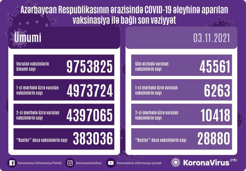 Ölkədə vurulan vaksinlərin ümumi sayı 9 753 825, birinci mərhələ üzrə vaksinasiya olunanların ümumi sayı 4 973 724, ikinci mərhələ üzrə vaksinasiya olunanların sayı isə 4 397 065 təşkil edir.