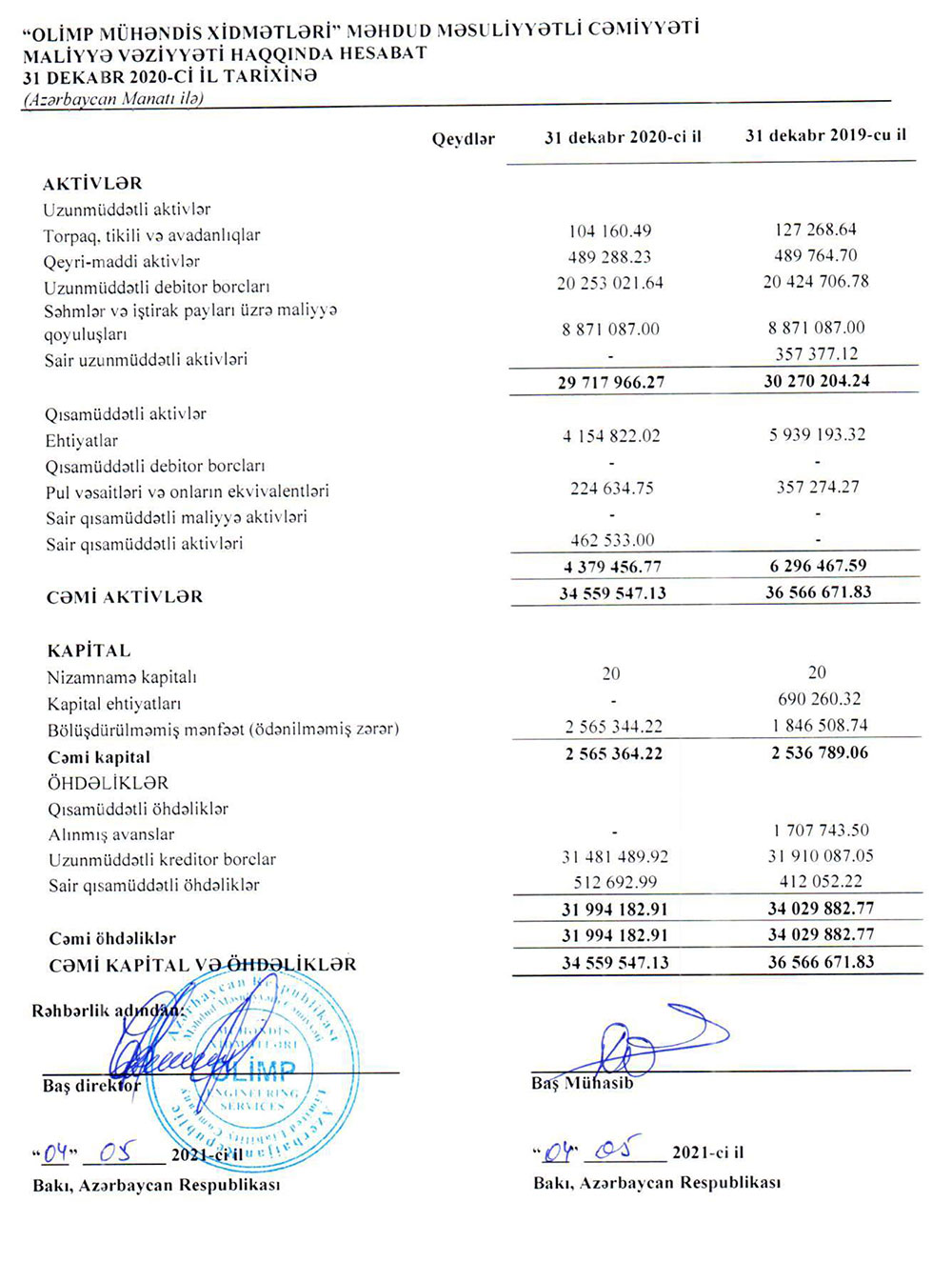 31 Dekabr 2020-ci il tarixində  "Olimp Mühəndis Xidmətləri" MMC 34 milyon 560 min manat cəmi aktivlərə malik olub.