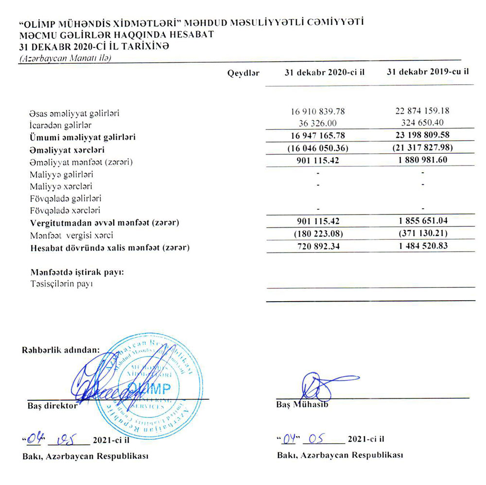 2020-ci ildə "Olimp Mühəndis Xidmətləri" MMC əməliyyat mənfəətindən 180 min manat mənfəət vergisi ödəyib.