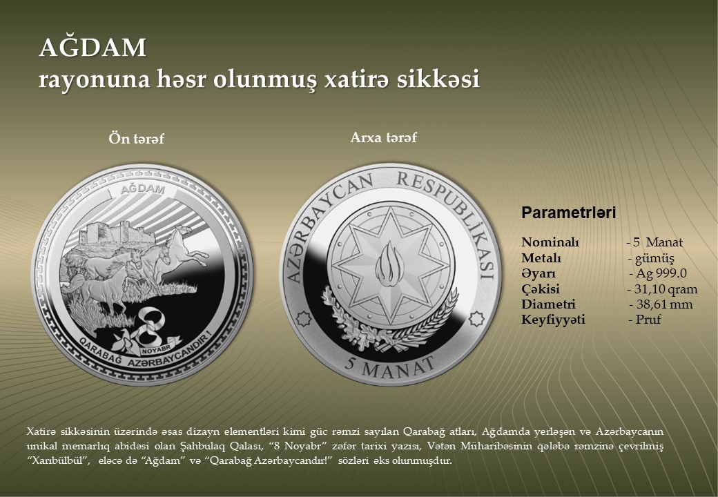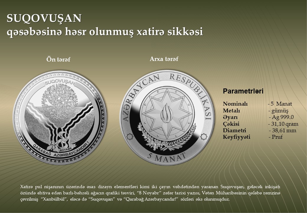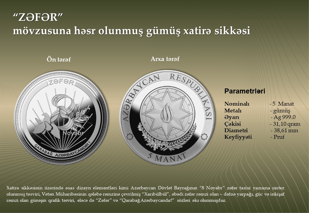 Azərbaycan Mərkəzi Bankı 500 manat nominallı “ZƏFƏR” xatirə banknotunun, qızıl və gümüşdən hazırlanmış “Zəfər” xatirə monetasının, eləcə də düşmən tapdağından azad edilmiş şəhər və rayonlarımızın tarixi-mədəni irsinin beynəlxalq ictimaiyyətə çatdırılması məqsədilə “Şuşa” şəhərinə, “Cəbrayıl”, “Qubadlı”, “Ağdam”, “Zəngilan”, “Füzuli”, “Laçın”, “Kəlbəcər”, “Xocavənd” rayonlarına və “Suqovuşan” qəsəbəsinə həsr olunan gümüş xatirə sikkələrinin tədavülə buraxılmasını elan edir. 20 manatlıq yenilənib, növbəti ildən tədavülə buraxılacaqAzərbaycan Respublikasının Silahlı Qüvvələrinin Ali Baş Komandanı İlham Əliyevin rəhbərliyi ilə 2020-ci ildə aparılmış 44 günlük Vətən Müharibəsində Azərbaycan ordusunun tarixi Zəfərinin ildönümü münasibətilə tədavülə buraxılan xatirə pul nişanlarının Mərkəzi Bankda təqdimat mərasimi keçirilib.
