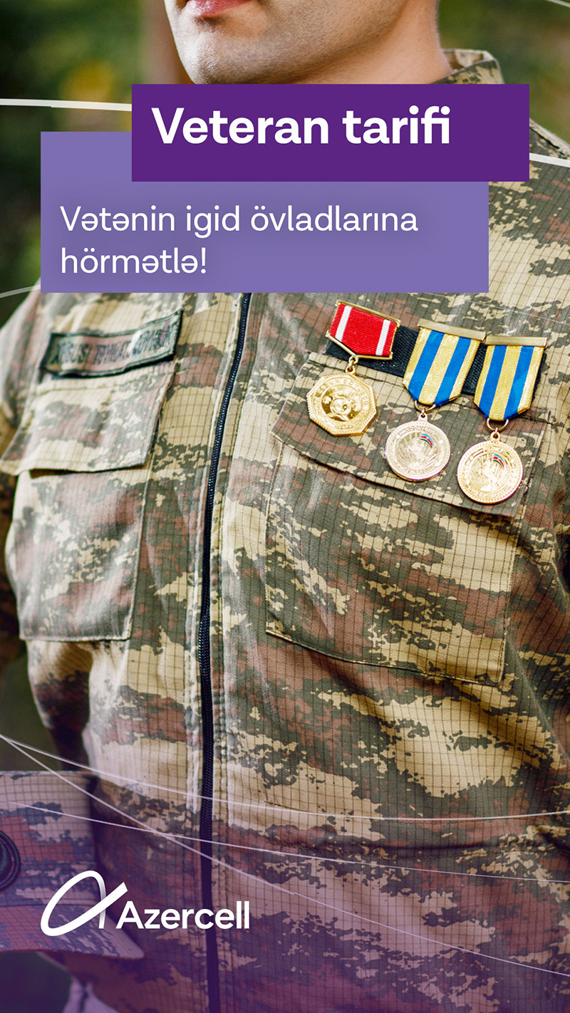 Azercell-dən Vətənin igid övladlarına hörmətlə! Şanlı qələbəmizin ildönümündə lider operator qazilərimizə “Veteran tarifi”-ni təqdim edir(®) Xalqımızın qəhrəmanlıq salnaməsi - Vətən müharibəsindəki böyük zəfərimiz Ali Baş Komandan və ölkə prezidenti cənab İlham Əliyevin rəhbərliyi altında Qarabağ uğrunda vuruşan, canından və sağlamlığından keçən əsgər və zabitlərin şücaəti hesabına gerçəkləşdi.