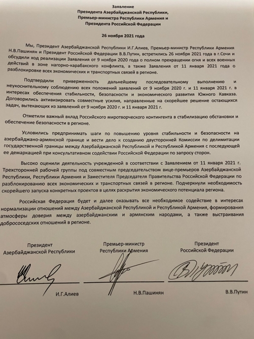 Biz, Azərbaycan Respublikasının Prezidenti İ.H.Əliyev, Ermənistan Respublikasının baş naziri N.V.Paşinyan və Rusiya Federasiyasının Prezidenti V.V.Putin 2021-ci il noyabrın 26-da Soçi şəhərində görüşdük və Dağlıq Qarabağ münaqişəsi zonasında atəşin və bütün hərbi əməliyyatların tamamilə dayandırılması haqqında 2020-ci il 9 noyabr tarixli Bəyanatın, həmçinin regionda bütün iqtisadi və nəqliyyat əlaqələrinin bərpası haqqında 2021-ci il 11 yanvar tarixli Bəyanatın yerinə yetirilməsinin gedişini müzakirə etdik.