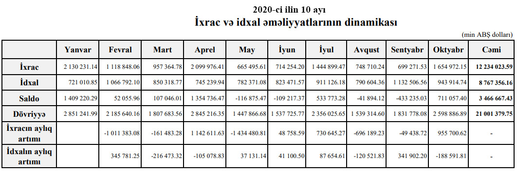Xatırladaq ki, 2020-ci ilin yanvar-oktyabr dövründə (10 ayında) Azərbaycanın xarici ticarət əməliyyatlarının həcmi 21 milyard 1 milyon 380 min ABŞ dolları, o cümlədən ixrac 12 milyard 234 milyon 23.4 min ABŞ dolları, idxal 8 milyard 767 milyon 356 min ABŞ dolları, müsbət saldo 3 milyard 466 milyon 667 min ABŞ dolları təşkil etmişdi.
