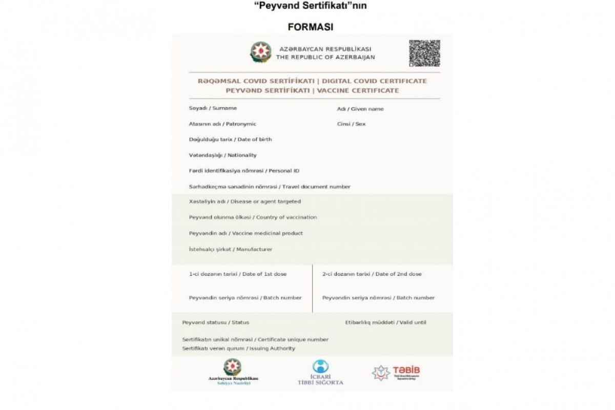 Eyni zamanda “Peyvənd Sertifikatı”, “Əks-göstəriş Sertifikatı”nın forması”, “COVID-19-RT-PZR Analiz Nəticəsi Sertifikatı”nın forması” və “İmmunitet Sertifikatı”nın forması” təsdiqlənib.