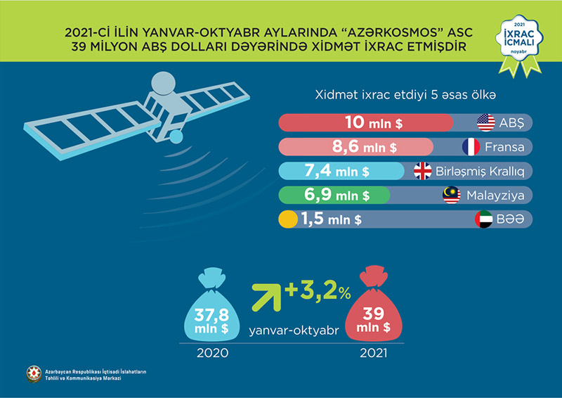 2021-ci ilin yanvar-oktyabr aylarında “Azərkosmos” ASC tərəfindən dünyanın 41 ölkəsinə 39 milyon ABŞ dolları dəyərində xidmət (peyk telekommunikasiya xidmətləri və optik peyk xidmətləri) ixrac edilib. “Azərkosmos” ASC-nin xidmət ixracından əldə etdiyi gəlir onun ümumi gəlirlərinin 91 faizini təşkil edib. 2021-ci ilin oktyabr ayında isə “Azərkosmos” ASC dünyanın 33 ölkəsinə 6,7 milyon ABŞ dolları dəyərində xidmət ixrac edib.