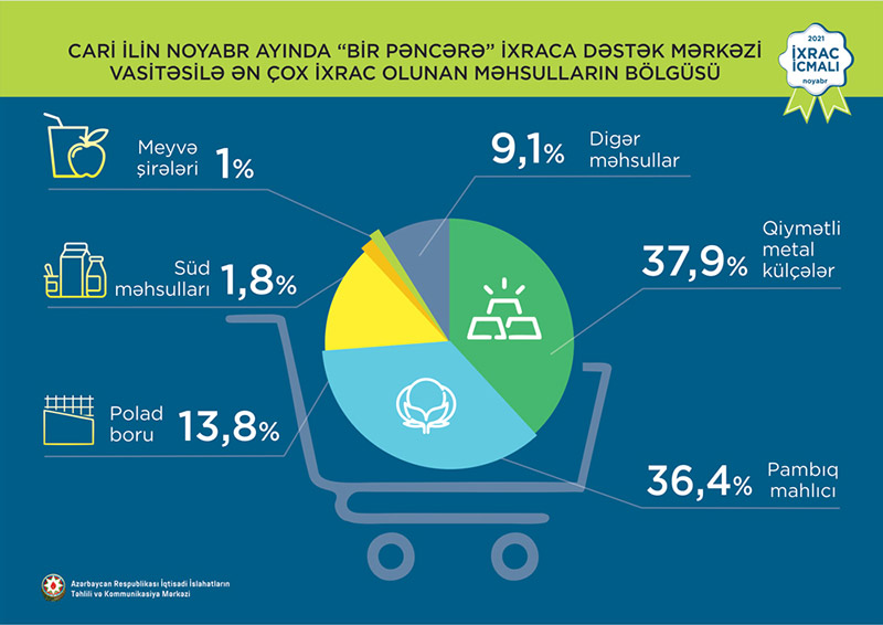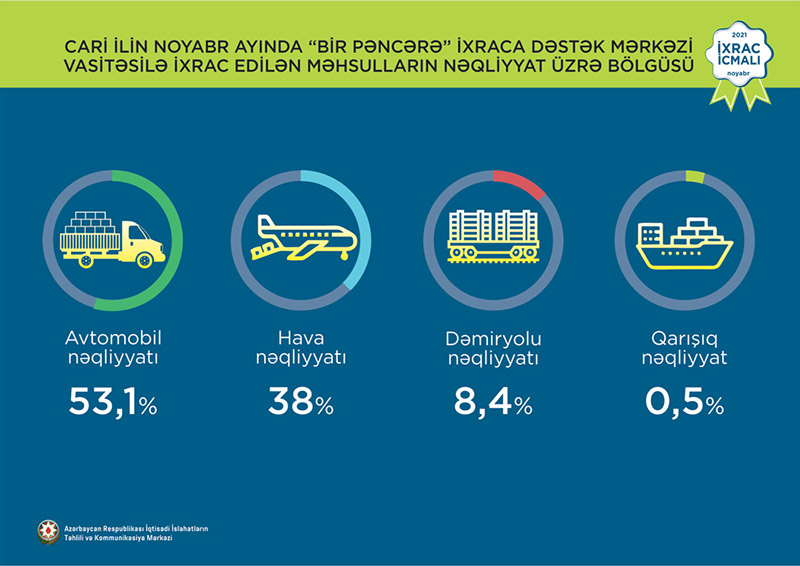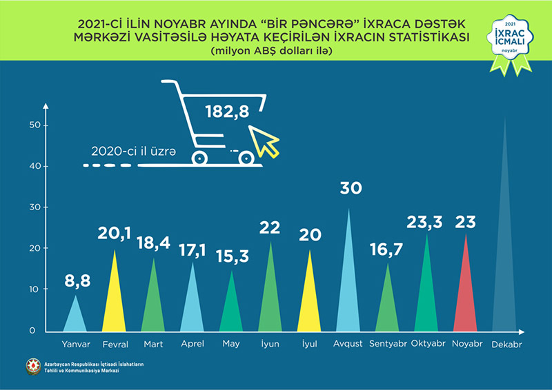 Həmçinin “İxrac İcmalı”nda göstərilib ki, 2021-ci ilin noyabr ayında “Bir Pəncərə” İxraca Dəstək Mərkəzi vasitəsi ilə həyata keçirilən qeyri-neft ixracının dəyəri 23 milyon ABŞ dolları olub. 2017-ci ildən 2021-ci ilin dekabr ayına qədər “Bir Pəncərə” İxraca Dəstək Mərkəzi vasitəsi ilə ixrac edilən mal və məhsulların dəyəri 688 milyon ABŞ dolları təşkil edib.