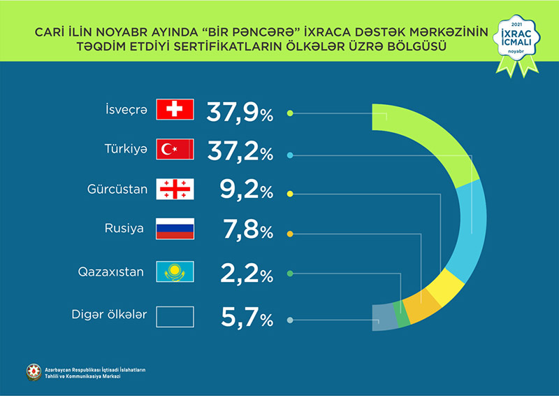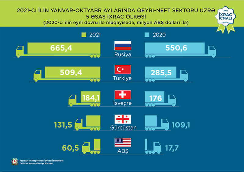 2021-ci ilin yanvar-oktyabr ayları ərzində Rusiya Federasiyasına 665,4 milyon ABŞ dolları, Türkiyəyə 509,4 milyon ABŞ dolları, İsveçrəyə 184,1 milyon ABŞ dolları, Gürcüstana 131,5 milyon ABŞ dolları və ABŞ-a 60,5 milyon ABŞ dolları dəyərində qeyri-neft sektoruna aid mal ixrac olunub.