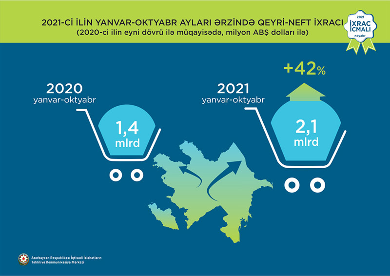 İqtisadi İslahatların Təhlili və Kommunikasiya Mərkəzinin “İxrac icmalı”nın noyabr sayına əsasən, 2021-ci ilin ilk 10 ayı ərzində Azərbaycanın ixracı 16,8 mlrd. ABŞ dolları, qeyri-neft sektoru üzrə 2,1 mlrd. ABŞ dolları təşkil edib.