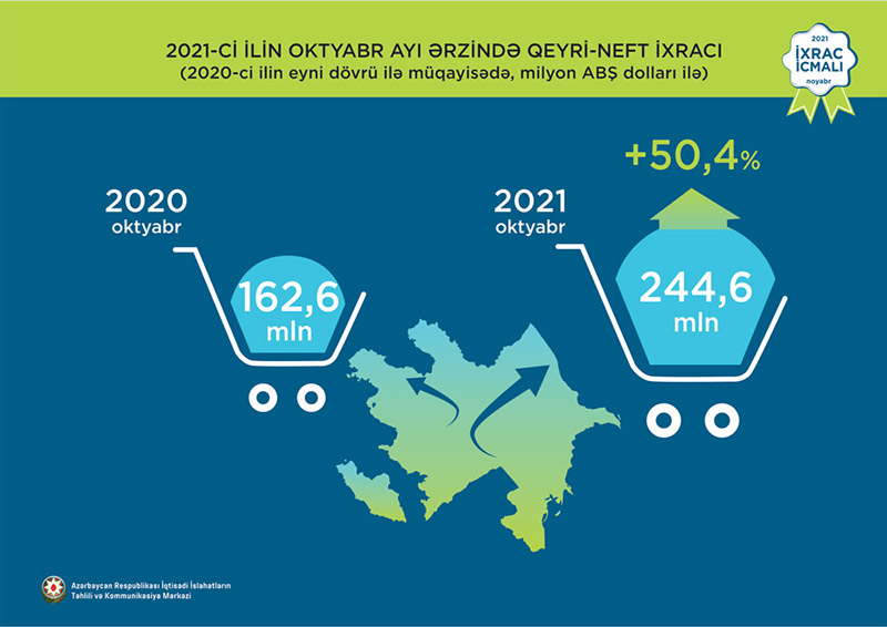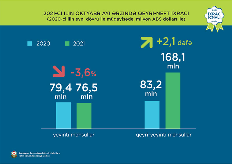 Normallaşma prosesinin davam etdiyi dövrdə oktyabr ayı üzrə ixrac 2,2 mlrd ABŞ dolları təşkil edib. Qeyri-neft sektoru üzrə ixracda artım 50,4% təşkil etməklə 244,6 mln ABŞ dolları olub. 2021-ci ilin oktyabr ayı ərzində yeyinti məhsulları üzrə ixrac 76,5 milyon ABŞ dolları təşkil edib. Qeyri-yeyinti məhsulları üzrə isə 2 dəfə artaraq 168 milyon ABŞ dolları təşkil edib.
