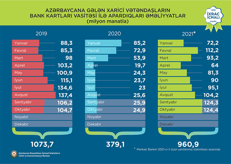 2021-ci ilin oktyabr ayında xarici vətəndaşların bank kartları vasitəsi ilə ölkəmizdə apardıqları əməliyyatların həcmi 124,4 milyon manat təşkil edib. 2021-ci ilin yanvar-oktyabr aylarında isə əcnəbilər bank kartları vasitəsi ilə 960,9 milyon manatlıq əməliyyat aparıblar.