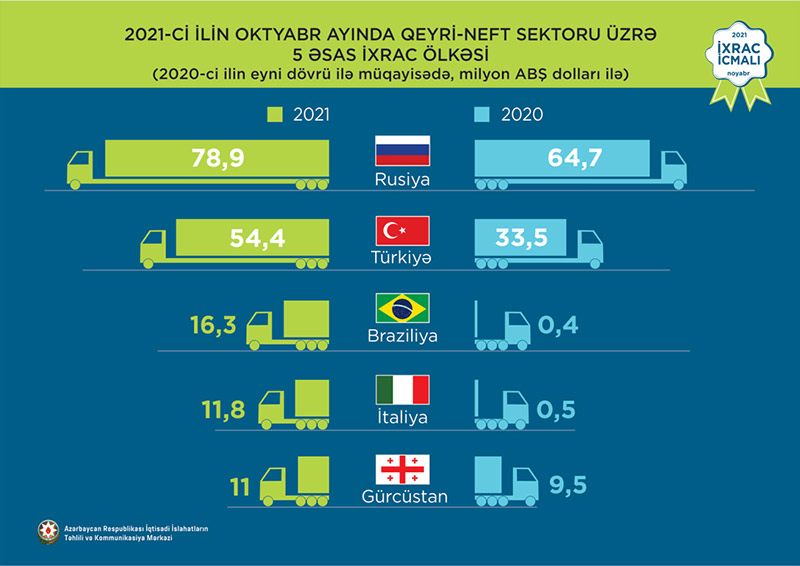 2021-ci ilin oktyabr ayında qeyri-neft sektoruna aid ən çox mal ixrac edilən ölkələrin siyahısında Rusiya Federasiyası (78,9 milyon ABŞ dolları) birinciliyə yüksəlib. Bu siyahıda Türkiyə ikinci (54,4 milyon ABŞ dolları) və Braziliya üçüncü (16,3 milyon ABŞ dolları) olub.