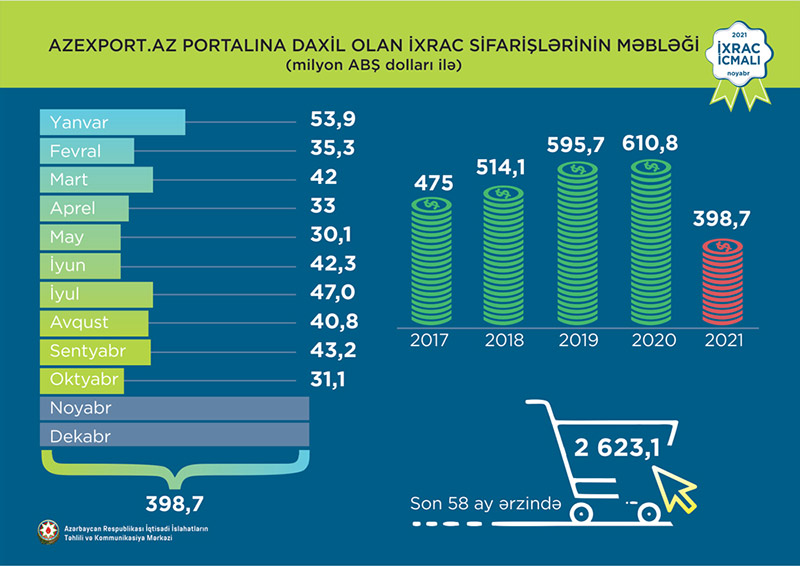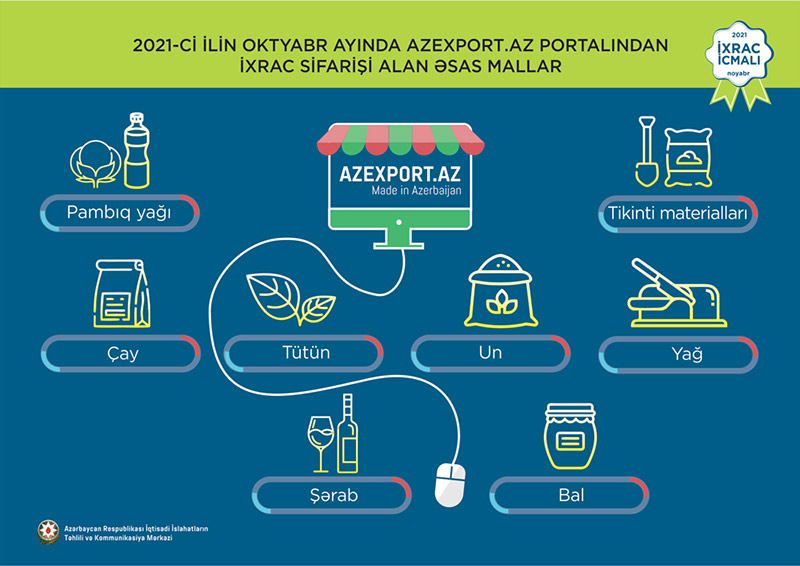 2021-ci ilin yanvar-oktyabr aylarında Azexport.az portalına 398,7 milyon ABŞ dolları dəyərində ixrac sifarişləri daxil olub. 2021-ci ilin oktyabr ayında Azexport.az portalına daxil olan ixrac sifarişlərinin dəyəri isə 31,1 milyon ABŞ dolları təşkil edib. 2021-ci ilin oktyabr ayında Azexport.az portalına ən çox ixrac sifarişi pambıq yağı, çay, zəli, tütün, un, tikinti materialları, yağ, şərab, bal, velosiped, armudu stəkan, qənnadı məhsulları, və s. mallara daxil olub. Məlumat üçün qeyd edək ki, 2017-ci ilin yanvar ayından 2021-ci ilin 31 oktyabr tarixinə kimi (58 ay ərzində) Azexport.az portalına dünyanın 238 ölkəsindən daxil olan ixrac sifarişlərinin dəyəri 2,62 milyard ABŞ dolları təşkil edib.