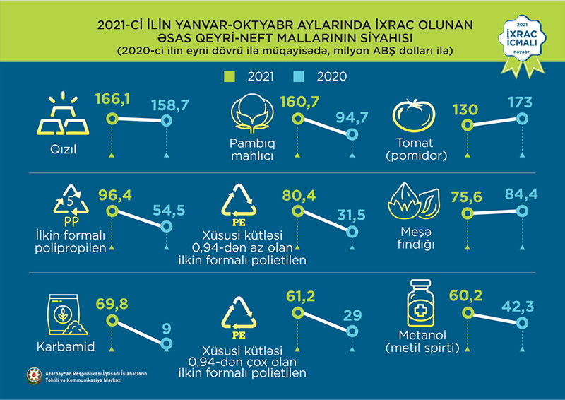 2021-ci ilin yanvar-oktyabr ayları ərzində ixrac edilən qeyri-neft sektoruna aid malların siyahısında qızıl (166,1 milyon ABŞ dolları) birinci olub. Bu siyahıda pambıq mahlıcı (160,7 milyon ABŞ dolları) ikinci, pomidor (tomat) (130 milyon ABŞ dolları) isə üçüncü yerdə qərarlaşıb.