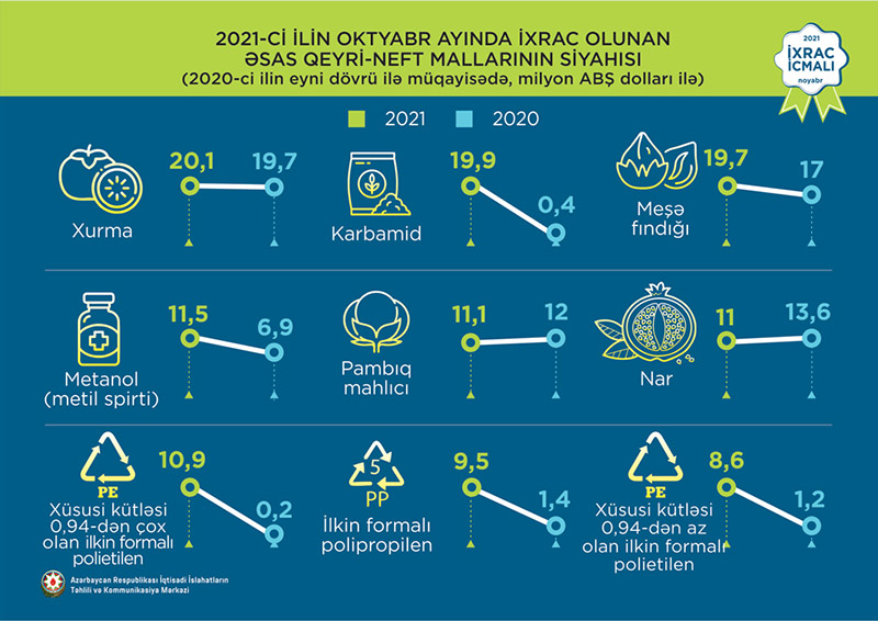 2021-ci ilin oktyabr ayında ixrac edilən qeyri-neft sektoruna aid malların siyahısında xurma (20,1 milyon ABŞ dolları) birinci, karbamid (19,9 milyon ABŞ dolları) ikinci və meşə fındığı (19,7 milyon ABŞ dolları) üçüncü olub.