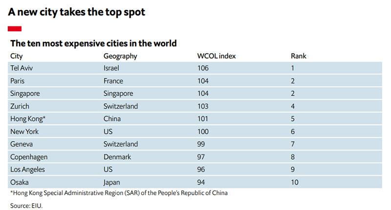 "Economist Intelligence Unit"in (EIU) illik hesabatına görə, İsrailin paytaxtı Təl-Əviv hazırda dünyada yaşamaq üçün ən bahalı şəhərdir. EIU Tel-Əvivin reytinqdə, əsasən İsrail valyutası şekelin “İsrailin Covid-19 peyvəndinin uğurlu yayılması ilə dollara qarşı bahalaşaması” səbəbindən yüksəldiyini qeyd edib.Təl-Əviv yaşayış xərcinə görə Paris və Honq-Konqu geridə qoyub və 2021-ci ildə dünyanın yaşamaq üçün ən bahalı şəhəri olub.