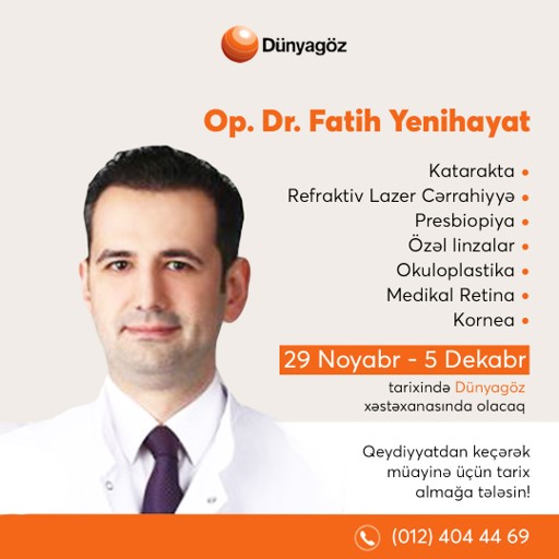 "Dünyagöz-Bakı" xəstəxanasında lazer əməliyyatı: 2 göz 900 manat. İstanbul və Ankara Dünyagöz xəstəxanalarından gələcək peşəkar həkimlər Azərbaycan xalqına xidmət göstərəcək.(®) 1996-cı ildən bu yana Türkiyədə 21, xaricdə 9 xəstəxana ilə xidmət göstərən "Dünyagöz" Xəstəxanalar Qrupu göz sağlamlığının bir nömrəli ünvanı olmaq prinsipini mənimsəyərək geniş kütlələrə çatmağa davam edir.