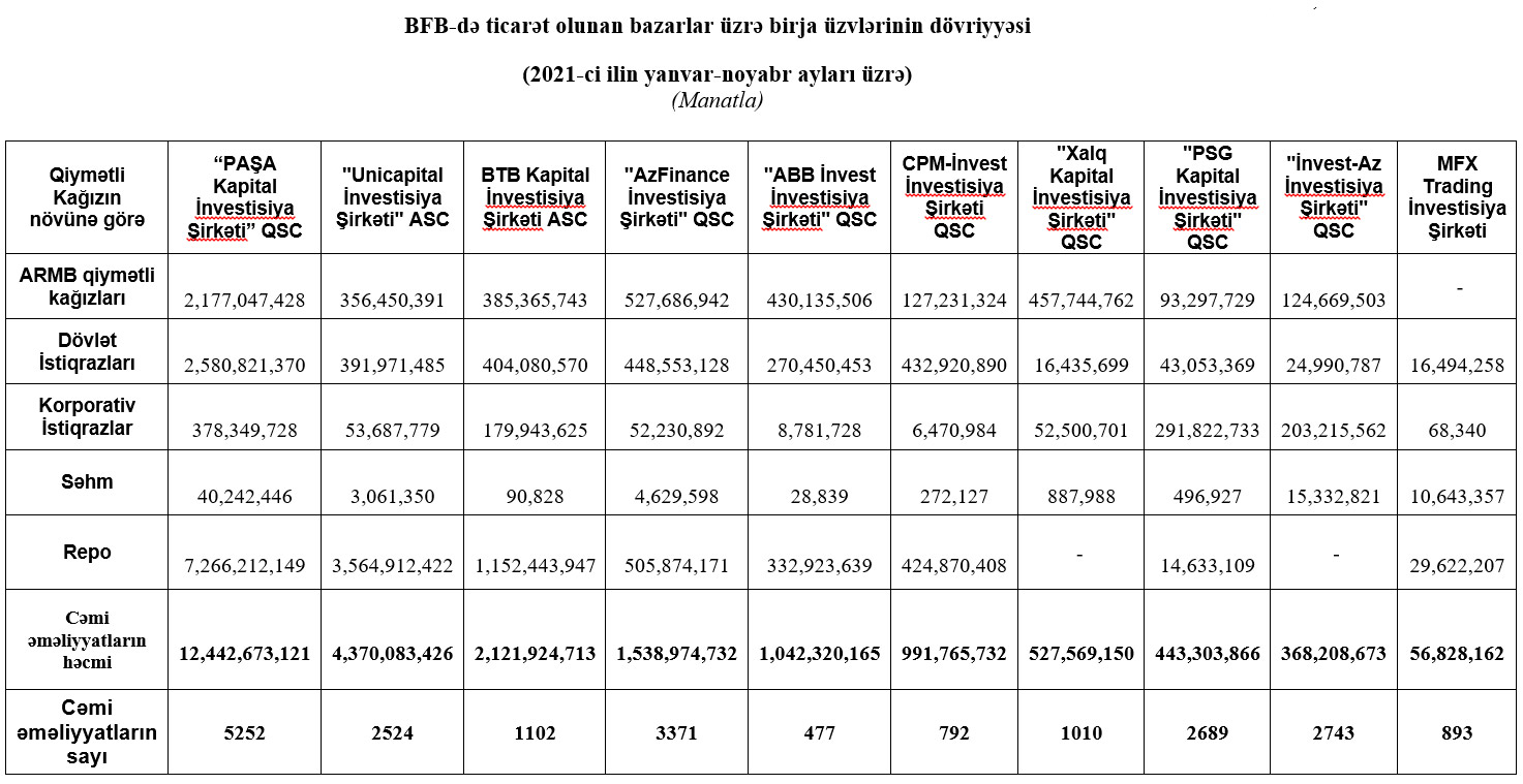 2021-ci ilin yanvar-noyabr ayları üzrə Bakı Fond Birjasında ticarət olunan bazarlar üzrə birja üzvlərinin dövriyyəsi açıqlanıb.