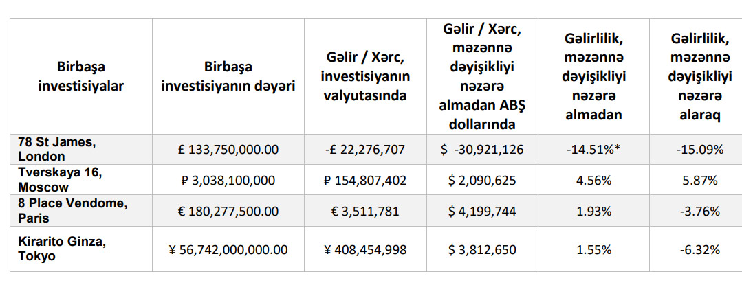 Dövlət Neft Fondunun Londonda yerləşən daşınmaz əmlakında 2018-ci ildə başlayan, hal-hazırda da davam edən təmir işləri və əmlakda icarəçinin olmaması Fondun daşınmaz əmlak portfelinin “birbaşa investisiyalar” alt bölməsində mənfi gəlirliliyə səbəb olub.