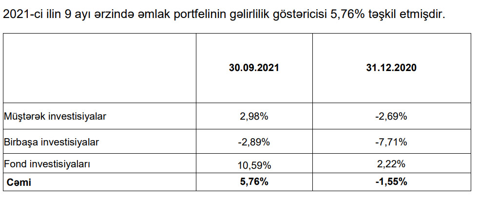 “Daşınmaz əmlak alt portfelinin strukturuna daxil olan birbaşa investisiyalar üzrə mənfi maliyyə nəticələri bu alt portfel üzrə digər gəlirli investisiya istiqamətlərinə üstünlük verməklə, birbaşa investisiya aləti üzrə iqtisadi şəraitin tələblərinə uyğun yeni tənzimləmə mexanizmlərinin tətbiqinə zərurət yarandığını deməyə əsas vermişdir”,- Rəydə deyilir.