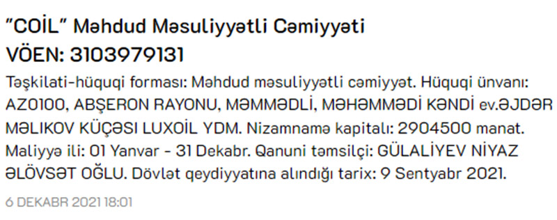 2 milyon 904 min 500 min manat nizamnamə kapitalına malik olan "COİL" şirkətinin qanuni təmsilçisi Gülaliyev Niyaz Əlövsət oğludur.
