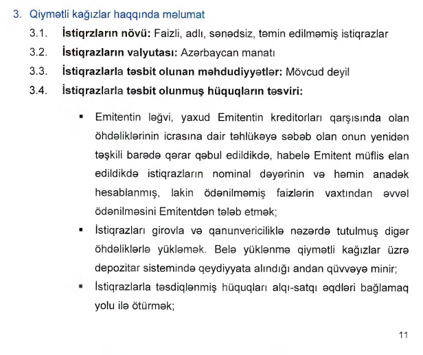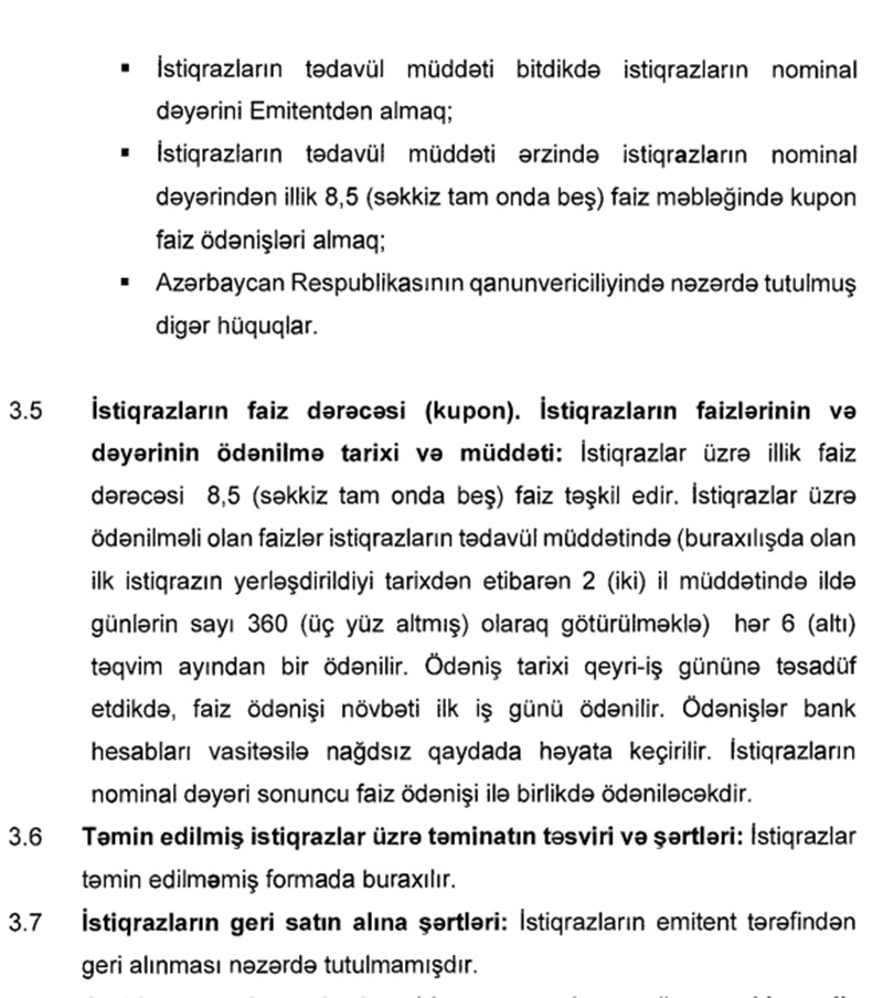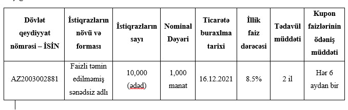 Hər bir istiqrazın nominal dəyəri 1 min manat, sayı 10 min ədəd, illik faiz dərəcəsi 8,5%, faizlərin ödəniş müddəti hər 6 aydan birdir.