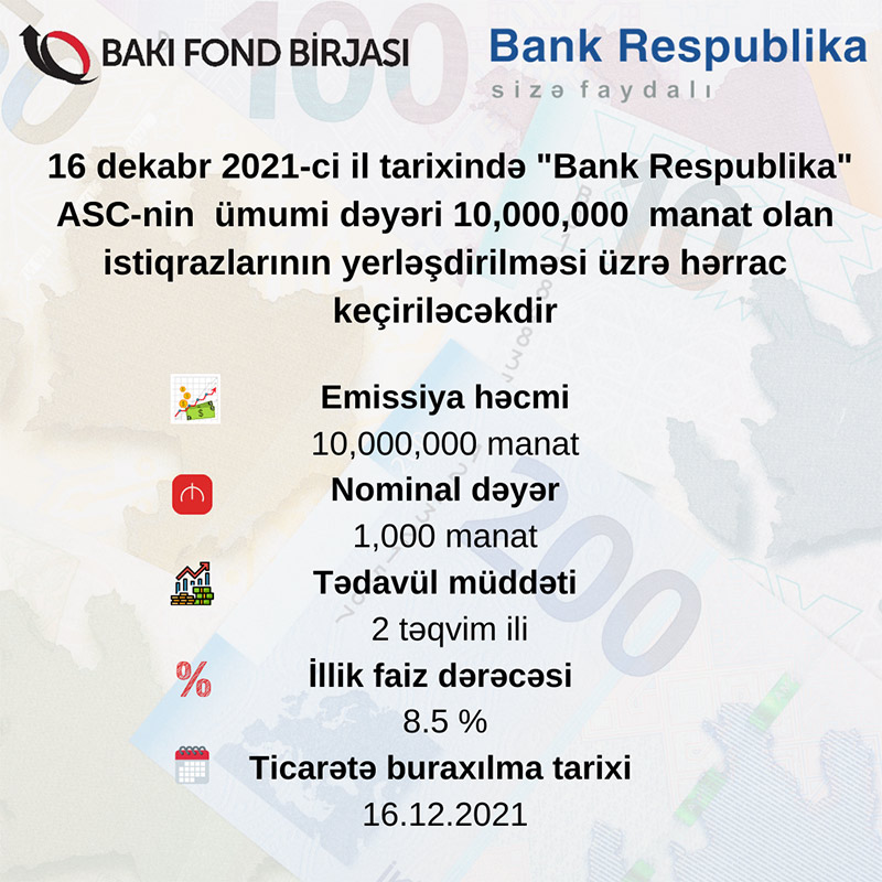 Birjadan Marja-ya daxil olmuş məlumata görə, 16 dekabr 2021-ci il tarixində "Bank Respublika" ASC-nin istiqrazlarının yerləşdirilməsi Bakı Fond Birjasında rəqabətli hərrac üsulu ilə həyata keçiriləcəkdir.