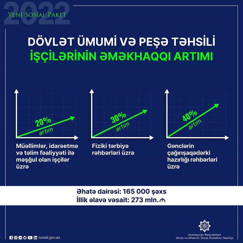 Artımların edilməsi məqsədlə 273 milyon manat illik əlavə vəsait nəzərdə tutulub2022-ci il yanvarın 1-dən dövlət ümumi təhsil müəssisələrində çalışan, bilik və bacarıqlarının diaqnostik qiymətləndirilməsi aparılan müəllimlərin maaşları orta hesabla 20%, gənclərin çağırışaqədərki hazırlığı rəhbərlərinin maaşları orta hesabla 40% artırılır.