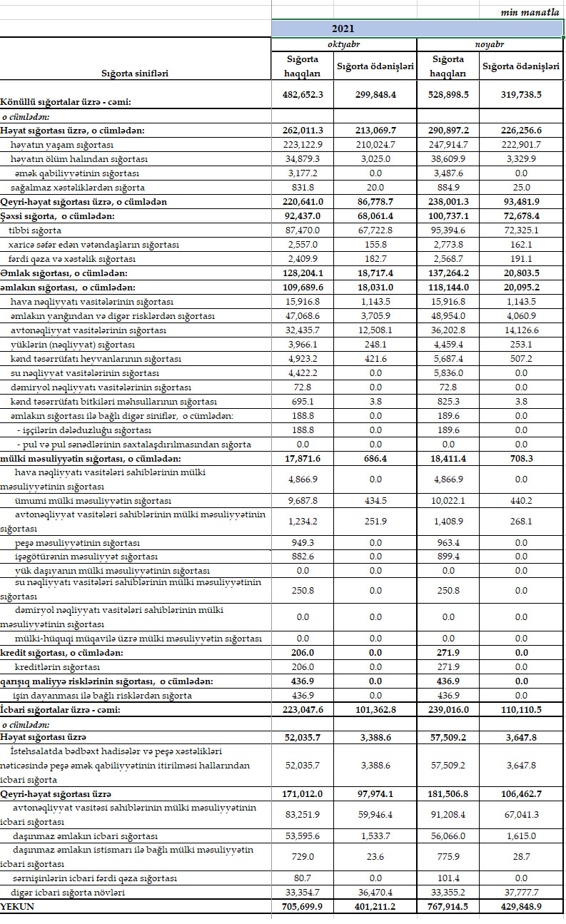 Bu ilin yanvar-noyabr aylarında Azərbaycandakı 20 sığorta şirkətinin xətti ilə 767 milyon 914 min manat məbləğində sığorta haqqı toplanılıb.