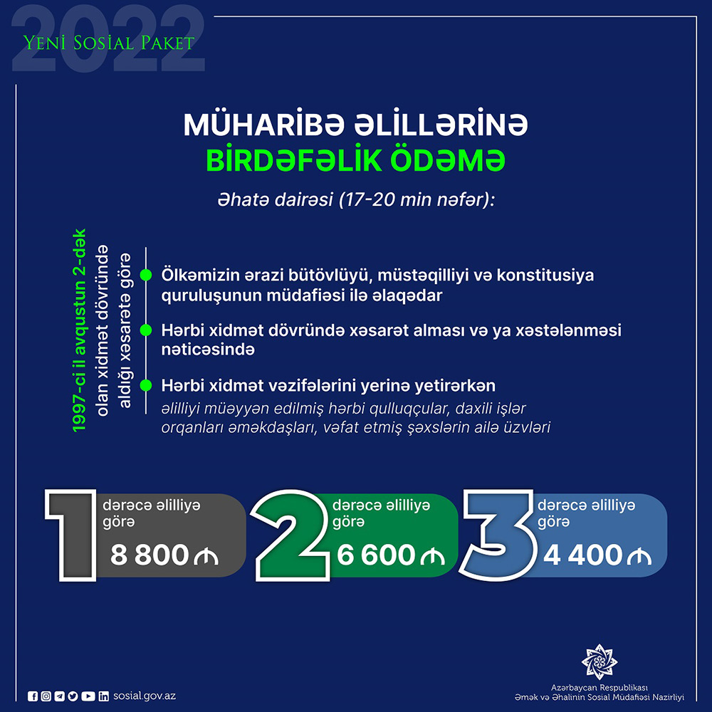 Bundan əvvəl Prezident İlham Əliyevin müvafiq Fərmanları ilə 2019-2020-ci illərdə Əmək və Əhalinin Sosial Müdafiəsi Nazirliyi 1997-ci il avqustun 2-dək Azərbaycanın ərazi bütövlüyü uğrunda həlak olmuş, ölmüş və hərbi əməliyyatlarla əlaqədar xəbərsiz itkin düşdüyünə görə ölmüş elan edilmiş hərbi qulluqçuların və daxili işlər orqanları əməkdaşlarının vərəsələrinə 11 min manat məbləğində birdəfəlik ödəmə verilməsi proqramını icra edib. 12,3 minə yaxın şəhidin 18 mindən çox vərəsəsi birdəfəlik ödəmə ilə təmin olunub.