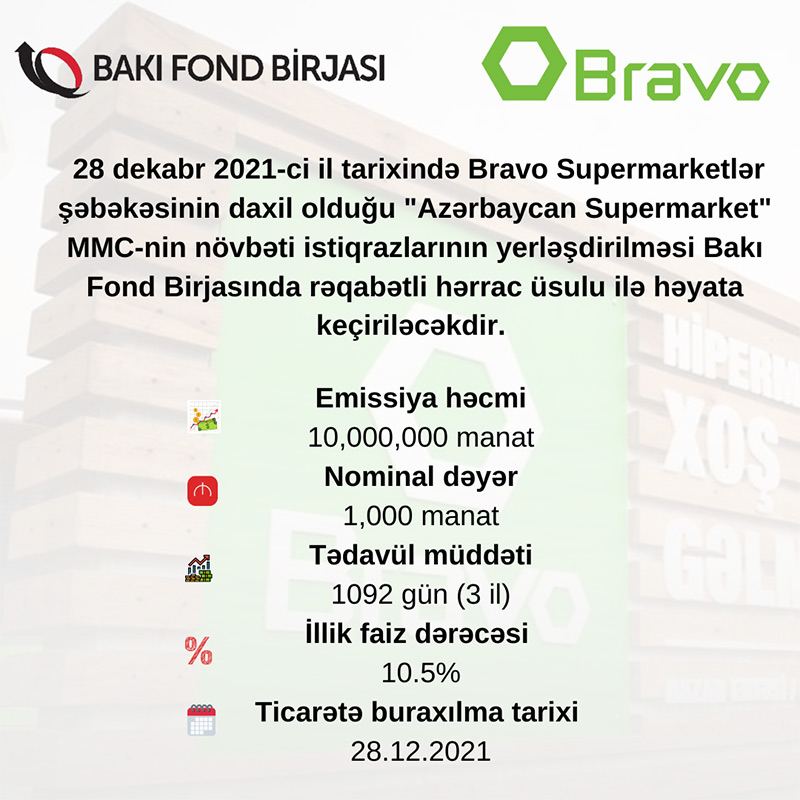 14 oktyabr 2021-ci il tarixində Bakı Fond Birjasının (BFB) Listinq Komitəsinin qərarı ilə Bravo Supermarketlər şəbəkəsinin daxil olduğu "Azərbaycan Supermarket" MMC-nin 10 milyon manatlıq istiqrazları standart bazar seqmentində listinqə daxil edilib.
