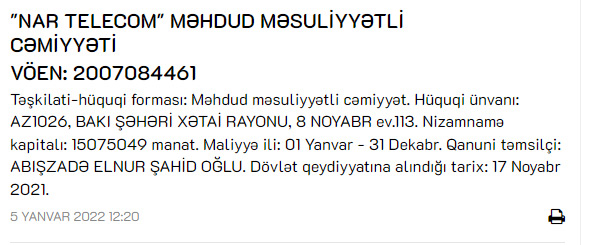 Dövlət Vergi Xidməti "Nar Telecom" Məhdud Məsuliyyətli Cəmiyyətini dövlət qeydiyyatına alıb.