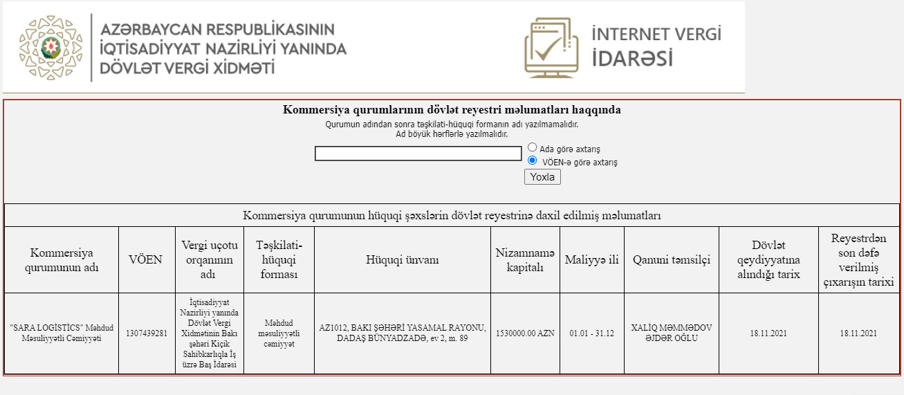 Dövlət Vergi Xidməti tərəfindən 1,53 milyon manat nizamnamə kapitalı ilə “Sara Logistics” MMC qeydiyyata alınıb.