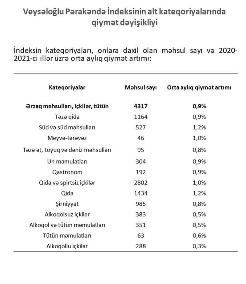 Veysəloğlu Şirkətlər Qrupu ən yüksək alıcı tələbatı olan məhsulların 2021-ci il üzrə qiymət indeksini açıqlayıb.
