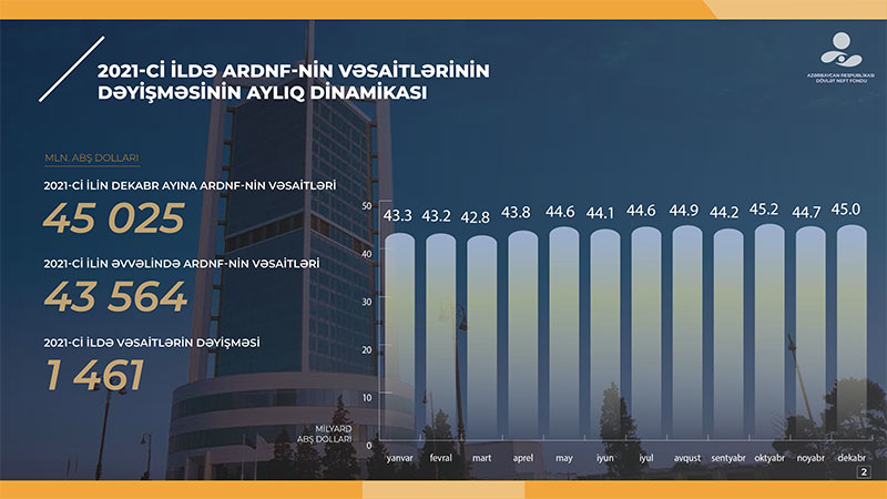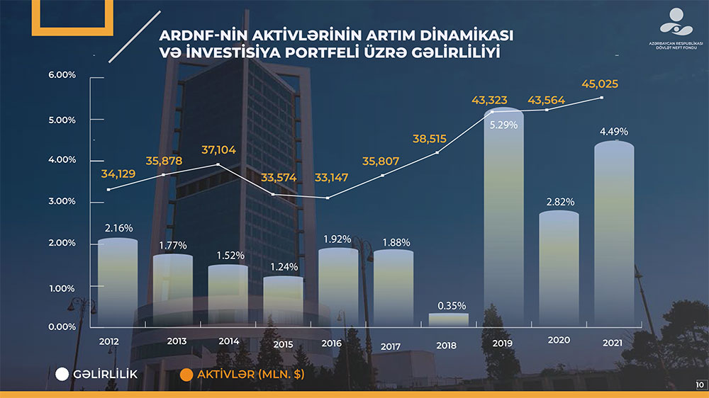 Azərbaycan Respublikası Dövlət Neft Fondu (ARDNF) bildirir ki, ilin yekunlarına əsasən Fondun aktivləri 45 milyard ABŞ dollarını üstələmiş və Fondun yaranma tarixindən etibarən investisiya fəaliyyəti çərçivəsində əldə olunan gəlir 10,2 milyard ABŞ dolları təşkil etmişdir (sozügədən gəlirlərin 8,9 milyard ABŞ dolları həcmindəki hissəsi son 10 ildə əldə edilmişdir).