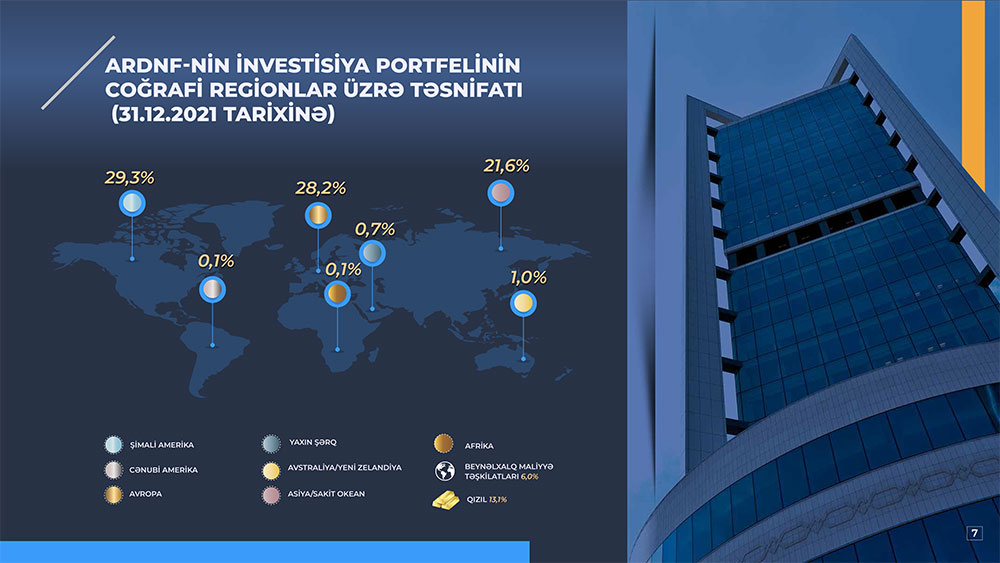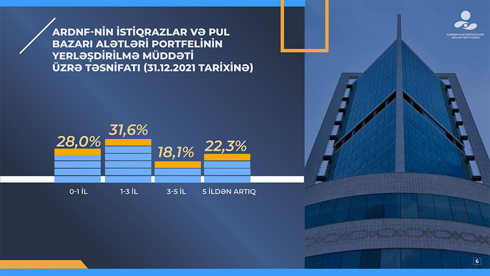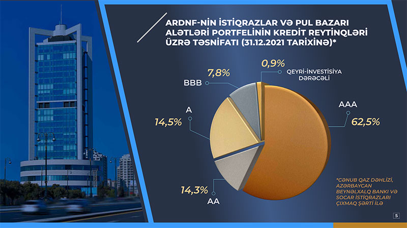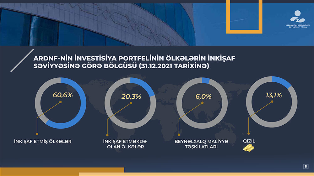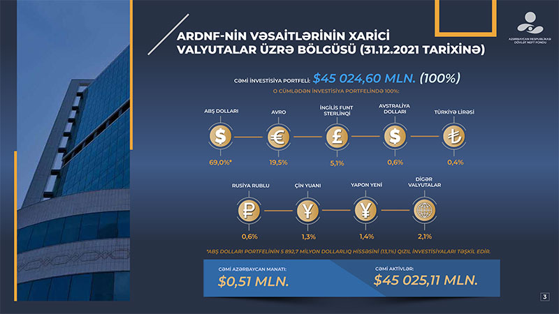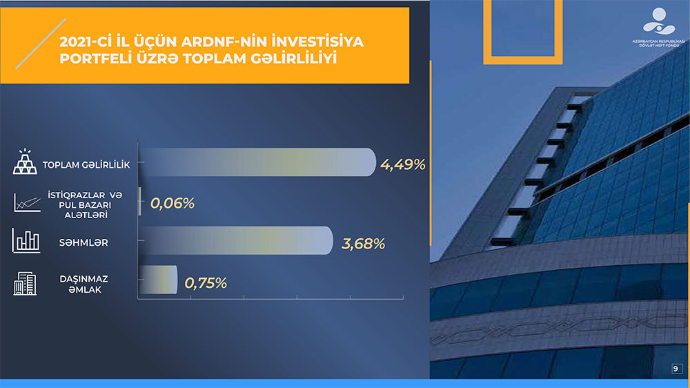 2022-ci il yanvarın 1-ə Fondun aktivləri 2021-ci ilin əvvəlinə (43 milyard 564,3 milyon ABŞ dolları) nisbətən 3,35 % və ya 1 milyard 461 milyon dollar artaraq 45 milyard 25,1 milyon ABŞ dollarına bərabər olmuşdur. Aktivlərin artımı ARDNF-nin büdcə gəlirləri, o cümlədən vəsaitlərin idarə edilməsindən əldə edilən gəlirlər hesabına olmuşdur. Müvafiq dövr ərzində ən yüksək gəlirlilik səhm alt portfelində müşahidə olunmaqla investisiya portfelinin hər bir tərkib aktiv növü üzrə müsbət gəlirlilik qeydə alınmışdır.